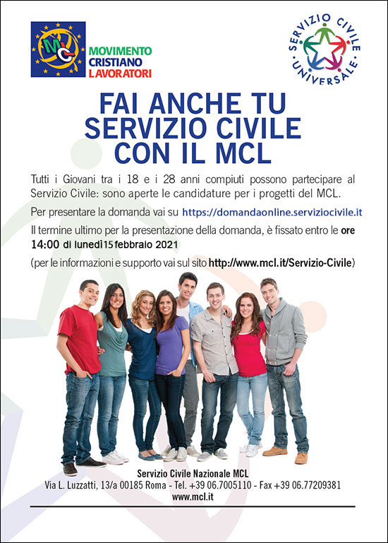 SI COMUNICA CHE I COLLOQUI DI SELEZIONE DEI CANDIDATI VOLONTARI DEL SERVIZIO CIVILE, AVRANNO INIZIO DAL GIORNO 4 MARZO 2021. SI INVIATNO I CANDIDATI A CONTRALLARE SISTEMATICAMNETE IL SITO MCL PER VERIFICARE GIORNO, SEDE E ORA , IN QUANBTO IL CALENDARIO VERRà AGGIORNATO QUOTIDIANAMENTE.